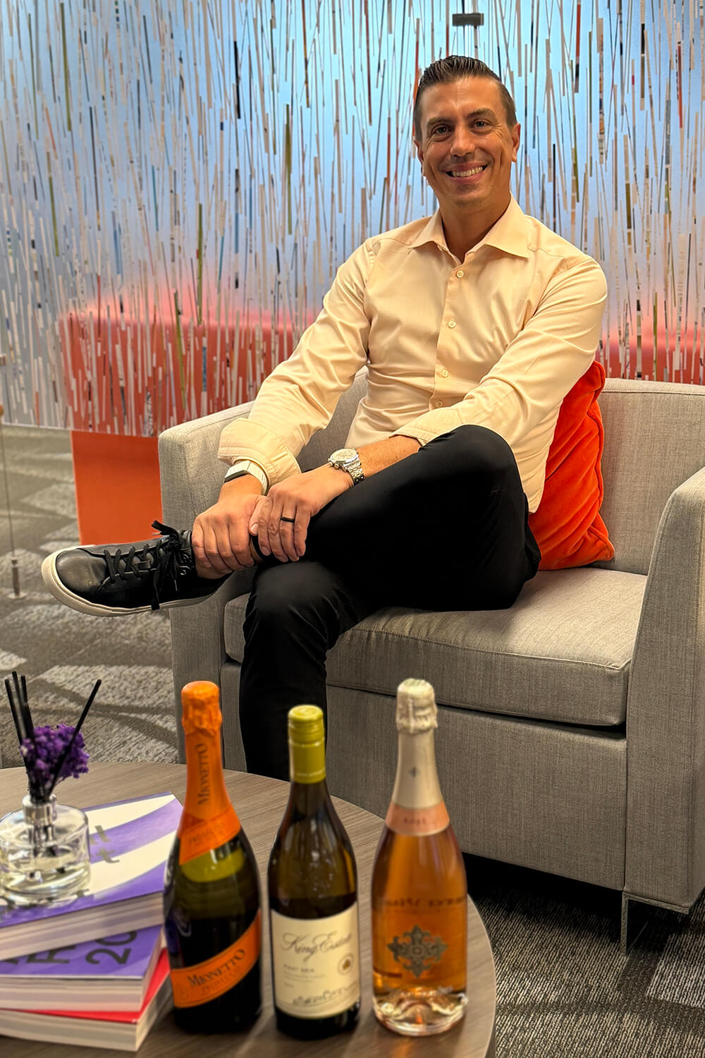 Curating the Collection: Tyler Pitman of HMSHost reviews a selection of on-premise labels, including Mionetto, King Estate, and Segura Viudas during a portfolio session.