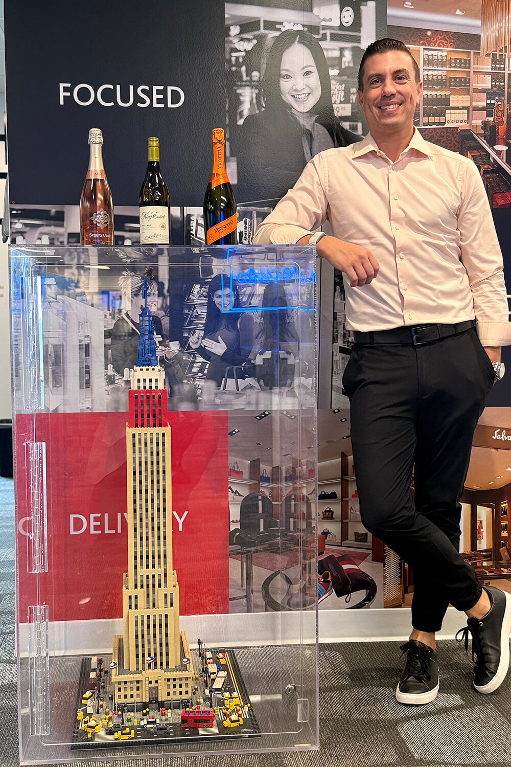 New Heights in Hospitality: Tyler Pitman poses next to a LEGO Empire State Building, showcasing the premium wine brands driving growth across North American travel hubs.